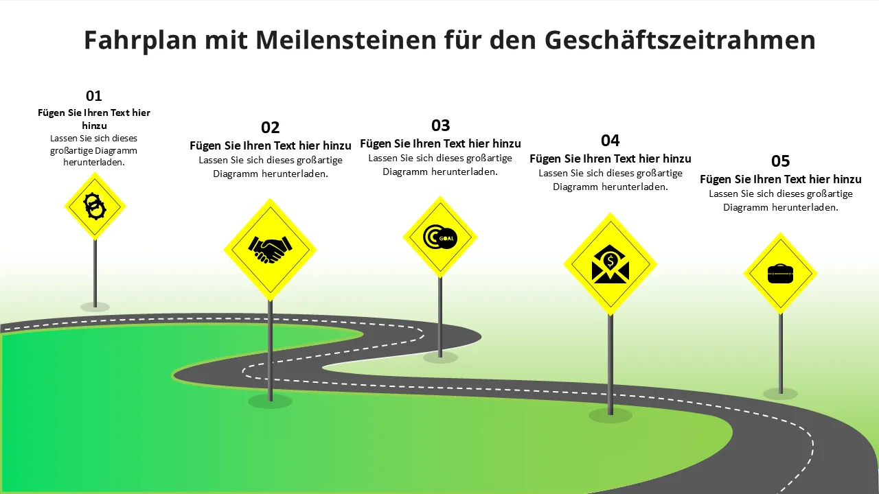 Roadmap mit Meilensteinen für Business Timeline Flaches PowerPoint-Design PowerPoint-Vorlage für professionelle Präsentationen