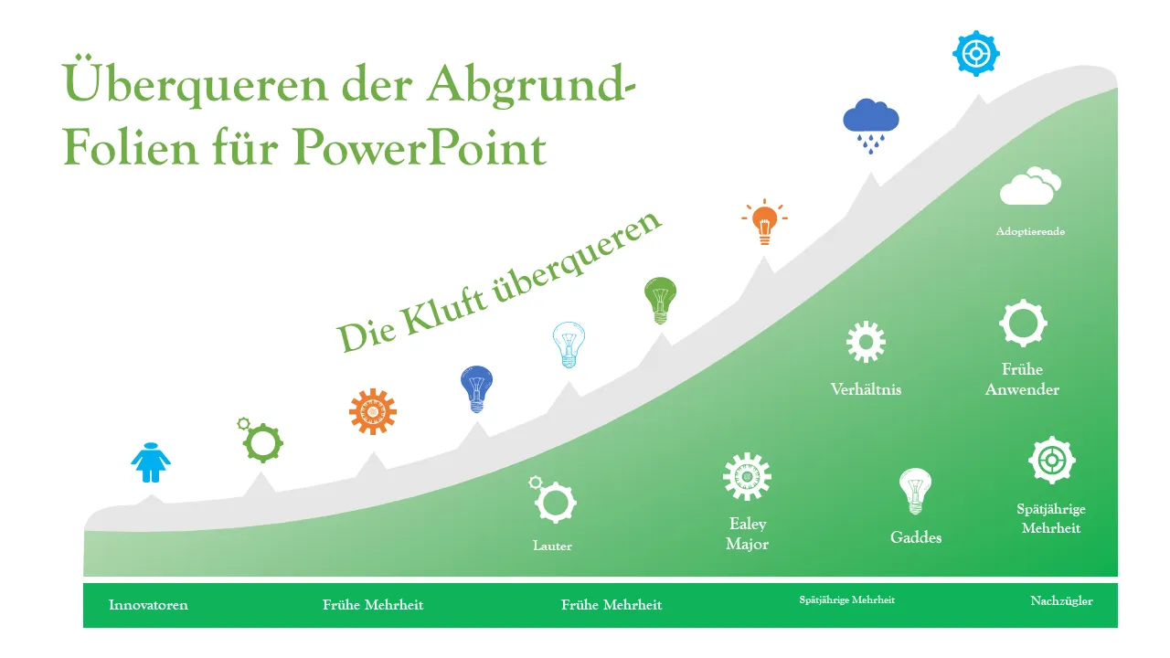 Professionelle PowerPoint-Vorlage für Startup-Gründer, um Investoren die Crossing The Chasm-Strategie vorzustellen. Enthält bearbeitbare Diagramme und klare visuelle Leitfäden für die Markteinführungs- und Produkteinführungsphasen.