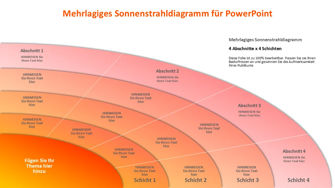 Ein visuell ansprechendes mehrschichtiges Sun-Ray-Diagramm für PowerPoint, das für die klare Darstellung von Daten, Prozessen und Schlüsselmetriken entwickelt wurde. Perfekt für Präsentationen von Geschäftsstrategien, Kundenvorschlägen und Teambesprechungen. Vollständig editierbar und druckfertig.