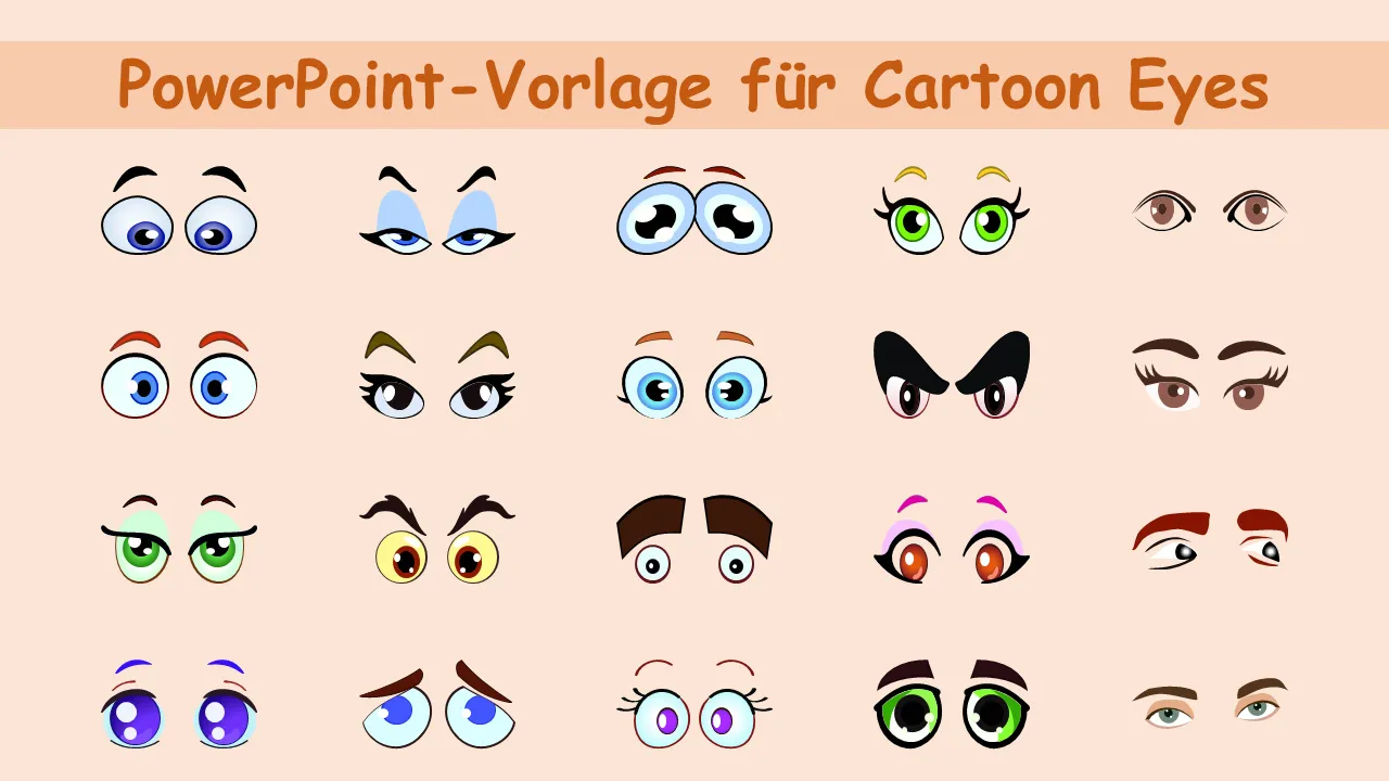 Eine verspielte Cartoon Eyes PowerPoint-Vorlage für unterhaltsame Markenpräsentationen. Perfekt für Startups, Pädagogen und Kreativteams, die visuelles Engagement benötigen. Laden Sie es jetzt herunter, um es einfach anzupassen.
