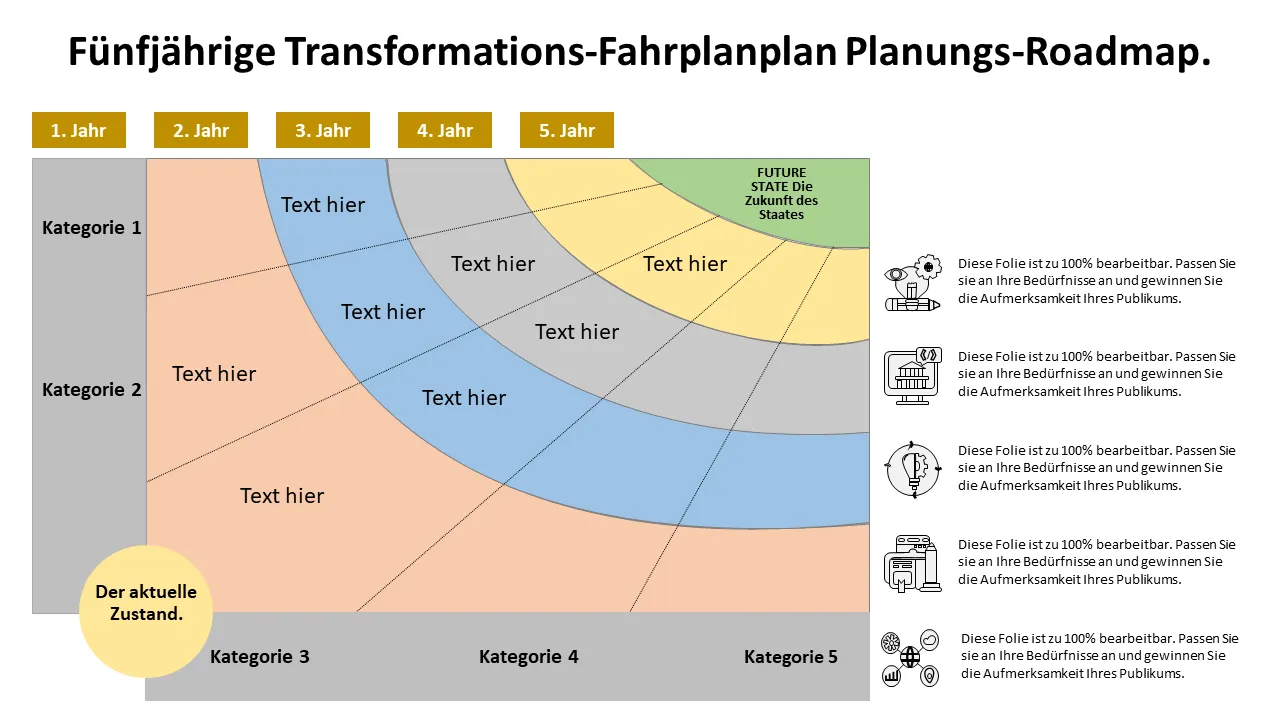 Ein professionell gestalteter Transformations-Roadmap-Plan für das Jahr für Präsentationen zur digitalen Transformation. Bearbeitbare Folien mit modernem Design, ideal für Geschäftsleute, Berater und Teams. Sauberes Layout, bereit zur individuellen Anpassung.
