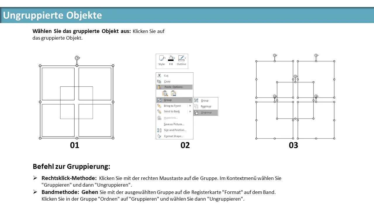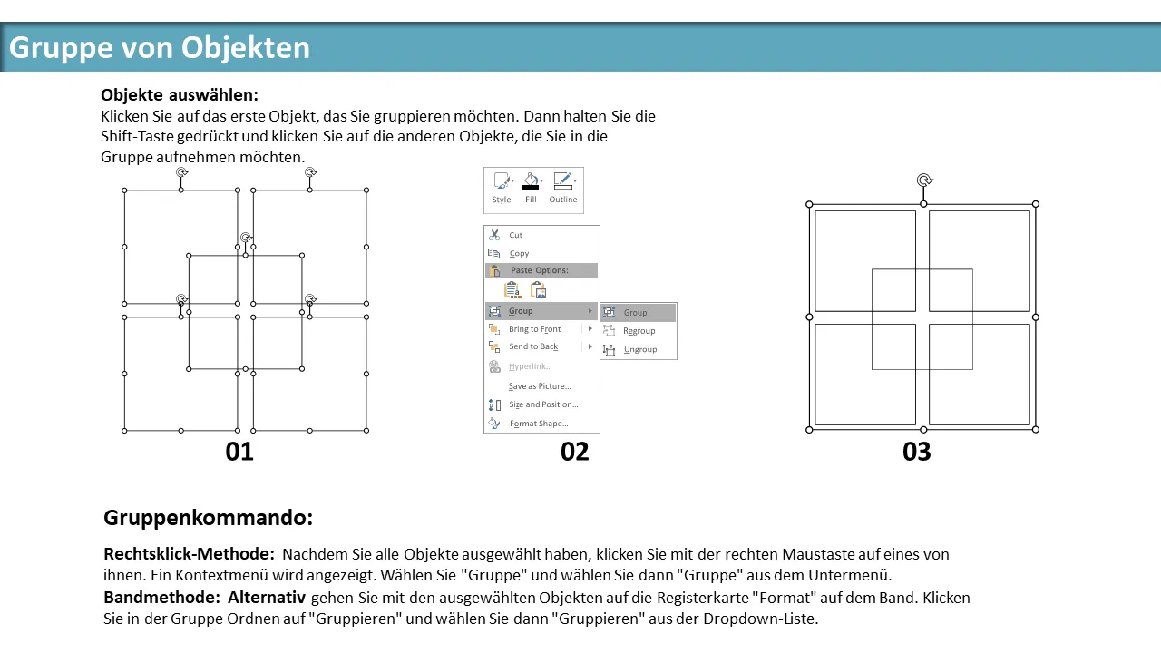 - Anweisungen zum Gruppieren und Aufheben der Gruppierung zur einfachen Anpassung von Elementen