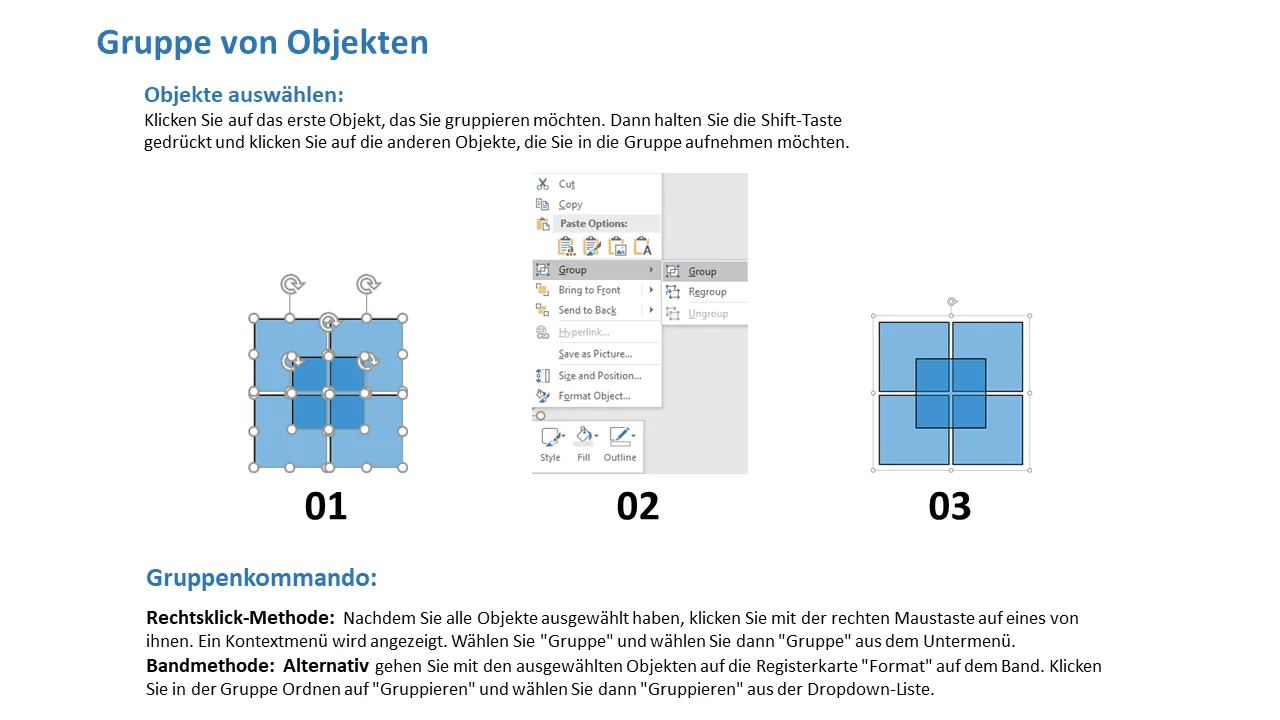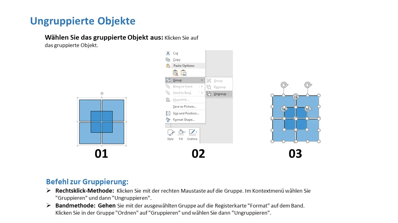 - Enthält Anweisungen zum Gruppieren und Aufheben der Gruppierung für erweiterte Folienbearbeitung