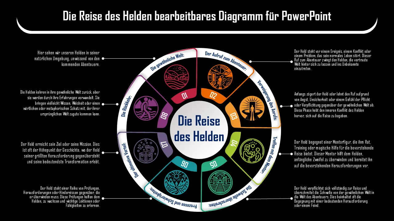 Hero's Journey Bearbeitbares Diagramm zur Powerpoint-Erklärung