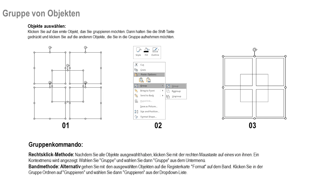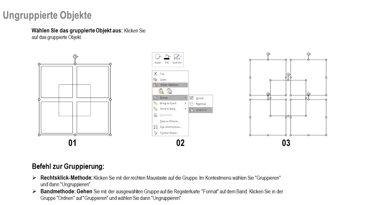 - Enthält Anweisungen zum Gruppieren und Aufheben der Gruppierung für eine einfache Bearbeitung