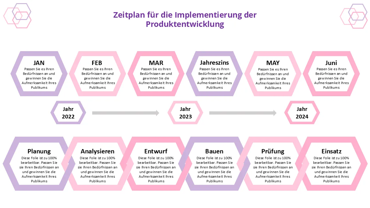 Zeitleiste der Produktentwicklungsimplementierung PowerPoint-Grafiken PowerPoint-Vorlage für professionelle Präsentationen